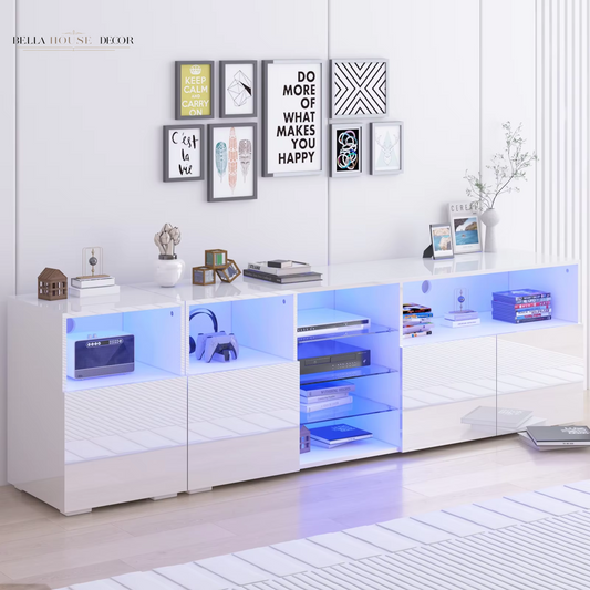 79" LED TV Stand for 75/80/85" TV, High Gloss TV Cabinet W/Adjustable Storage Shelf, Modern Entertainment Center, White/Black